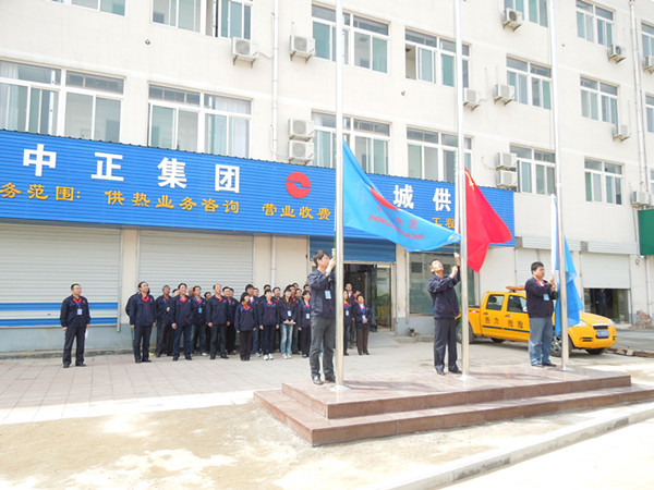 2012年4月28日,泰安市中正東城供熱有限公司辦公場所喬遷,現(xiàn)場進行了隆重的首次升國旗、司旗儀式。集團公司領(lǐng)導(dǎo)到場祝賀并對其現(xiàn)場環(huán)境整治情況進行了檢查驗收。